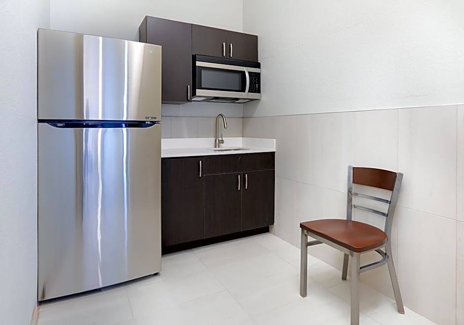 1 King Bed Suite Studio Full Kitchen is 409 square feet and includes a king-size bed 150-183 width plus desk, hairdryer, and ironing set.